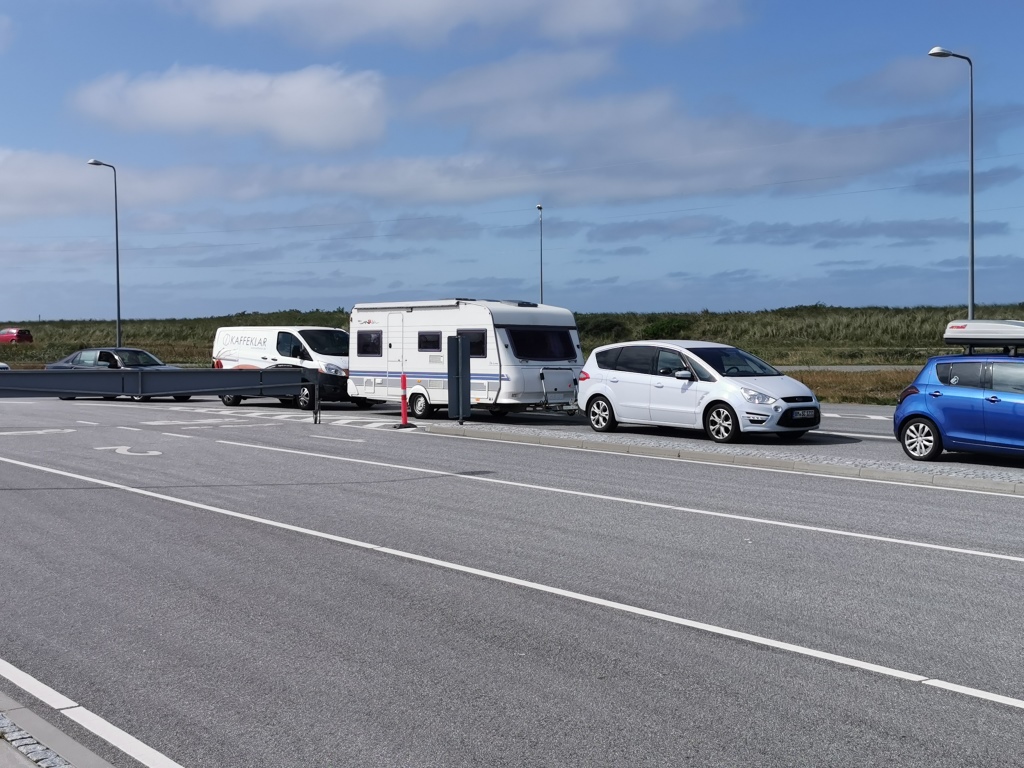 Wir wenden über die fünf geisterhaft leeren Wartespuren am alten Fähranleger und fahren zurück auf die Hauptstraße / Route 181 in südlicher Richtung. Kurz darauf entdecken wir auf der linken Seite dann auch die vertraute Schlange an Autos und die Schilder zur Fähre, wo sich offenbar der neue Fähranleger von Thyboron befindet! Na geht doch. Falls ihr auch mal mit der Fähre von Thyboron nach Agger fahren wollt, guckt auf jeden Fall genau auf die Schilder und vertraut nicht unbedingt dem Navi! Auf der Google Maps Karte (Stand Sommer 2023) wird übrigens noch immer die Route der Fähre zum alten Fähranleger angezeigt…