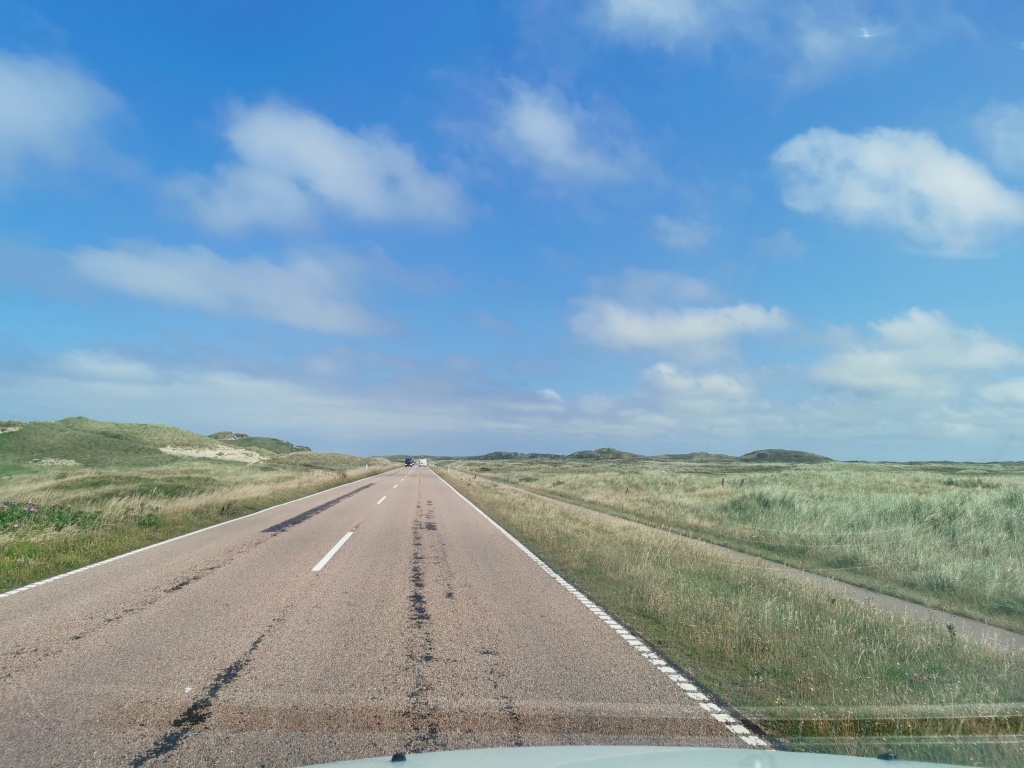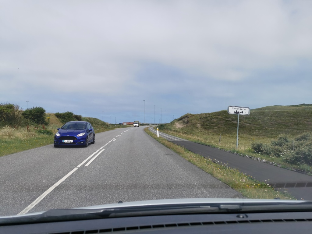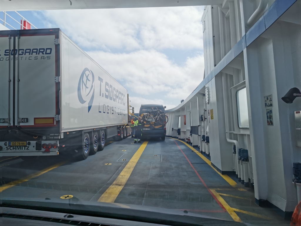 Etwa 20 Minuten hat der wilde Ritt gedauert, bis wir am gegenüberliegenden Fährhafen, ein paar Kilometer südlich von Agger, wieder anlegen. Wie zu erwarten war, darf natürlich der Lastwagen als allererstes von der Fähre runter. Dann folgt die mittlere Reihe der PKW und erst dann dürfte der Campervan vor uns rausfahren. Zumindest theoretisch! Denn als die Ladeborde frei zur Ausfahrt für unsere letzte Reihe ist, steht er weiter unbewegt herum. Nix tut sich! Es dauert eine Minute, es dauert gefühlt eine zweite. Ich hupe.