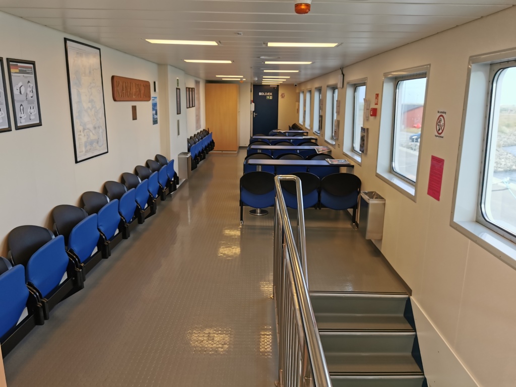 Mit den Jungs erklimme ich das erste Oberdeck. Da aber die Aussicht von hier nicht so toll ist, probieren wir eine Türe und erreichen eine kleine geschlossene Lounge, wo man die Überfahrt ebenfalls verbringen kann. Wir sind allerdings die einzigen hier. Auf der Rückseite der Lounge spazieren wir durch die nächste Türe und sind auf dem Achterdeck, wo es die zweite Aussichtsplattform gibt. Hier ist die Aussicht schon besser, aber man kann nicht nach vorne rausgucken! Das ist auch wiederum blöd.