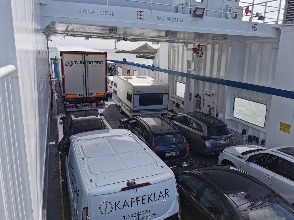 Der Deckoffizier nimmt mich in Empfang und meine anfängliche Euphorie schlägt in Enttäuschung um. Offenbar braucht er unser breites Wohnwagengespann auf der rechten Seite direkt an der Schiffsreling, wo es am wenigsten stört und den wenigsten Platz einnimmt. Dies bedeutet, dass wir zwar als dritte auf die Fähre auffahren durften, aber wohl als einer der letzten nachher nach dem Anlegen von der Fähre herunter fahren.