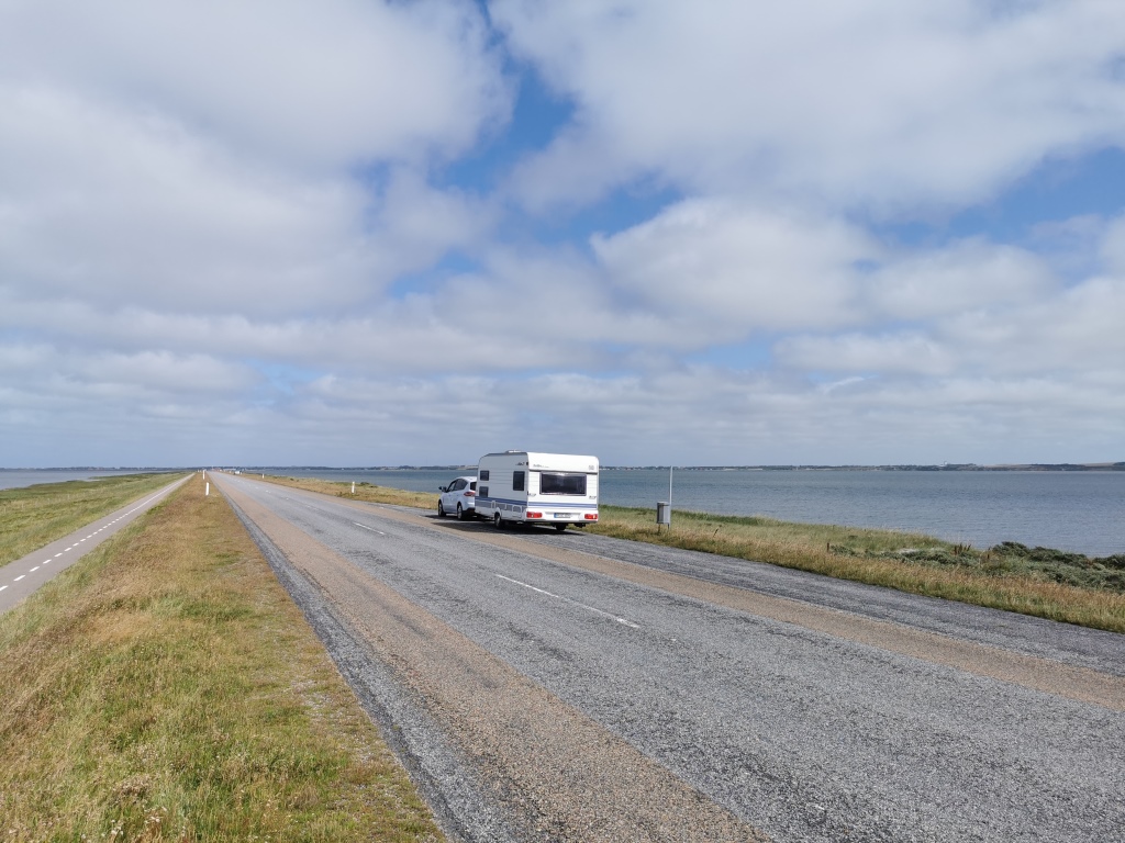 Auch wir sind kurz darauf wieder an Land entlassen und fahren die 181 Richtung Agger hinauf. Die Route ist bildschön, besonders wenn die Sonne durch die Wolken bricht. In der Mitte vor uns nur der schmale Damm, rechts und links schäumt und kräuselt das Wasser in urgewaltigen Wellen, vom wilden Wind gepeitscht. Eine tolle Kulisse, ich stoppte bei der erstmöglichen Gelegenheit für ein paar schöne Fotos fürs Familienalbum…