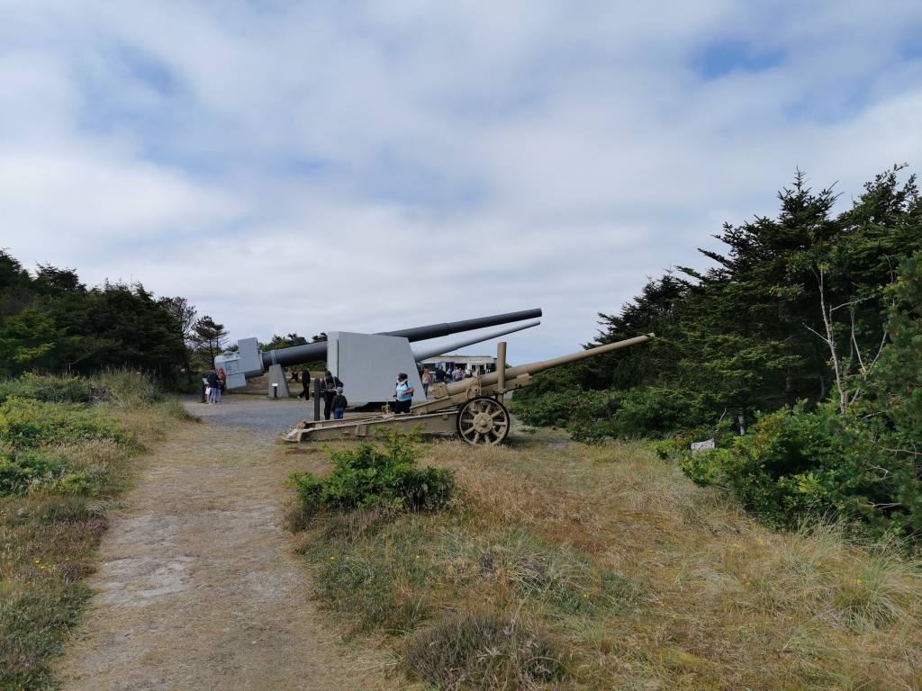 Besonders hat mich interessiert, ob der große Parkplatz gleich bei den Geschützen, wo wir damals auch mit dem Wohnmobil geparkt haben, noch immer existiert. Fürs Gespann ist dieser ebenfalls gut geeignet und ja, es gibt diesen Parkplatz noch immer! Ich bin sicher, dass man dort auch super mit dem Wohnwagengespann hätte parken können! Wenn es nur nicht so voll wäre! Schon als wir vom Hafenweg nach rechts zur Bunkeranlage abbiegen, sehen wir die zahlreichen Autos rechts und links am Wegesrand stehen! Spontan fahre ich ebenfalls nach rechts auf den Randstreifen der Zufahrtsstraße drauf. Auf das Parkareal brauchen wir erst gar nicht drauffahren, da wird garantiert kein freies Plätzchen zu bekommen sein! Besonders nicht für uns mit Anhang.