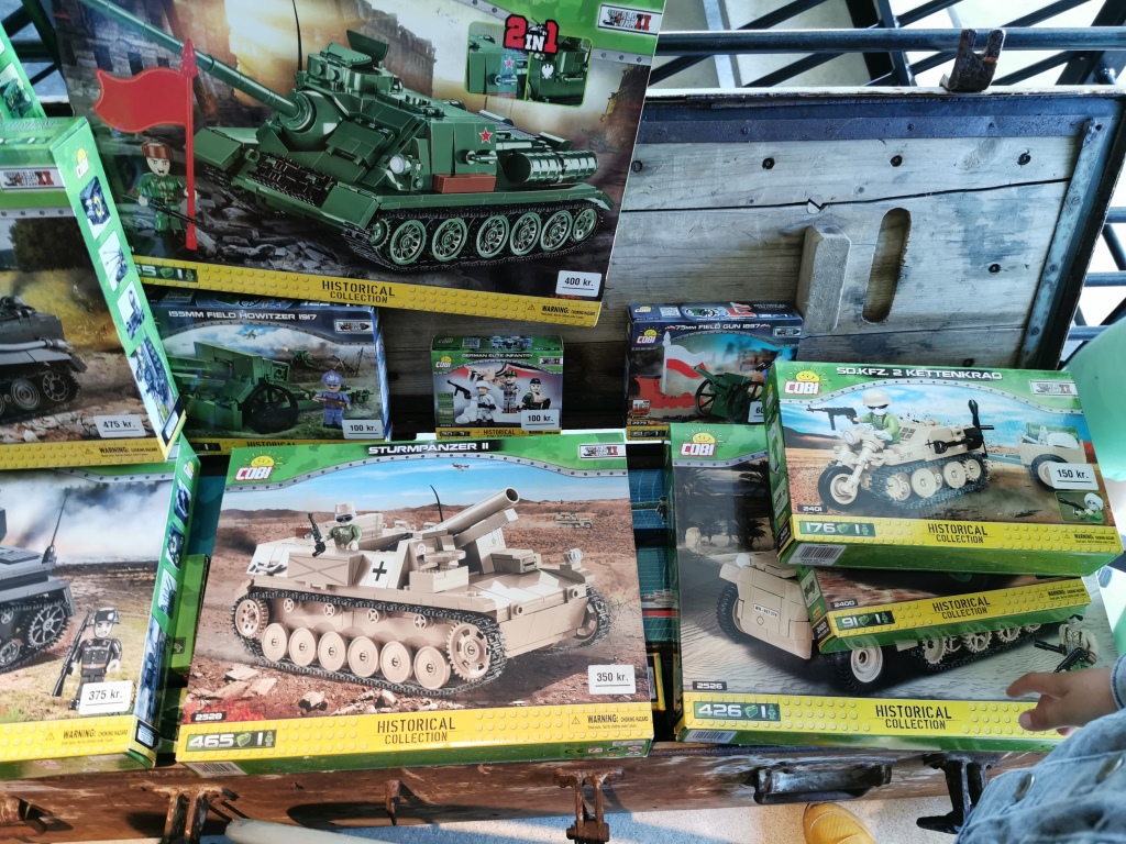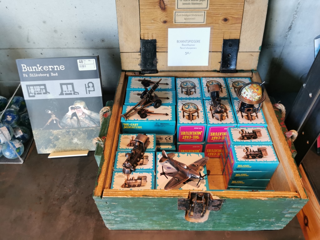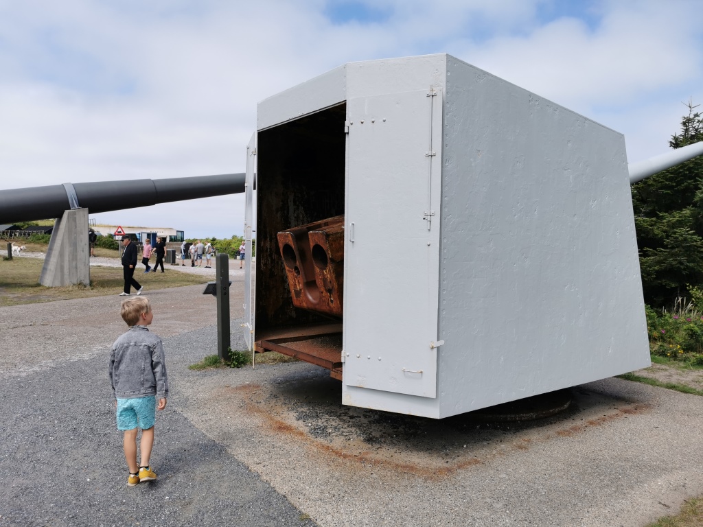 Wie schon bei unserem ersten Besuch erkennen wir gleich die drei Kanonen und das einzelne Kanonenrohr wieder, mit der uns schon damals die Anlage willkommen geheißen hat. Feldkanone, Flugabwehrgeschütz, Schiffsgeschütz, die verschiedensten mittleren Brummer zur See und an Land können wir hier unter die Lupe nehmen. Anders als in Deutschland sehen die Dänen das auch nicht so eng, wenn man hier mit „Händen und Füßen“ die Ausstellungsstücke untersucht. Gerade für Kids ist natürlich sofort die Phantasie einer Seeschlacht allgegenwärtig und sie schießen auf ein imaginäres feindliches Schlachtschiff gleich vor uns voraus. Ein Glück ist es nur ein Spiel. Hoffen wir, dass es nie mehr ernst wird.