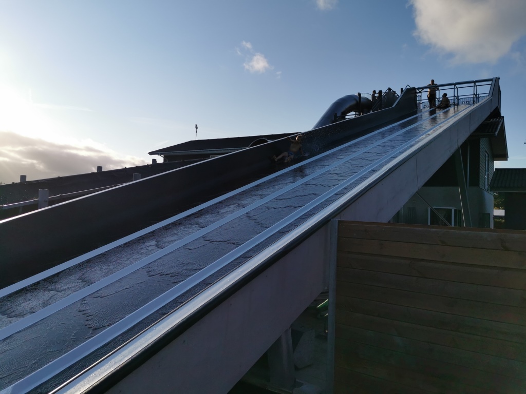 Zurück am Wohnwagen ziehen wir uns noch flott die Badehose über und wollen wenigstens noch mit dem letzten Sonnenstrahlen, bevor sich eine dicke Wolkenfront vor die Sonne schiebt, in den Pool springen. Bis 22 Uhr ist dieser geöffnet, ein sehr bequemes zeitliches Polster. Das Wasser ist sogar angenehm warm und kompensiert die allmählich immer frischer werdende Luft. Nur auf dem Rutschenturm zieht es ordentlich! Aber es lohnt sich, die beiden Rutschen sind schon was Besonderes! Wobei ich sagen muss, dass ich in der Röhrenrutsche nur dieses eine Mal rutschen werde! Im Verlauf der wilden Fahrt verliere ich komplett die Kontrolle und lande unsanft auf der Gummimatte am Röhrenausgang. Das ist zwar so gewollt, ist aber auch kein schönes Gefühl mehr mit dem freien Fall und kurzen Flug. Man hat Sorge, dass man sich beim Aufschlag richtig wehtun könnte. Das Ding ist wirklich nur was für die Jugend. Ich glaube, ich werde alt. 😉