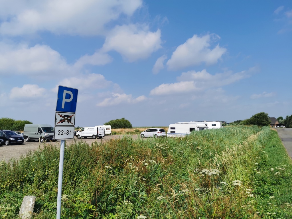 Der Platz selbst ist ausreichend groß, aber auch schon ausreichend gut besucht. Im hinteren Eck stehen ein paar Camper mit dem Wohnmobil, aber keiner mit einem Wohnwagen. Egal! Wir stellen uns selbstbewusst einfach mal dazu und müssen erkennen, dass man mit einem Wohnmobil hier super parken kann, ein langes Gespann allerdings doch deutlich über die gedachten Parkplatzbegrenzungen hinaus ragt. Fast schon mutig streckt unser Familienvan seine Nase nach vorn gleichso, als wolle er ein Wettrennen gegen die Wohnmobile um eine halbe Fahrzeuglänge gegen den fetten Liner in der Ecke gewinnen!