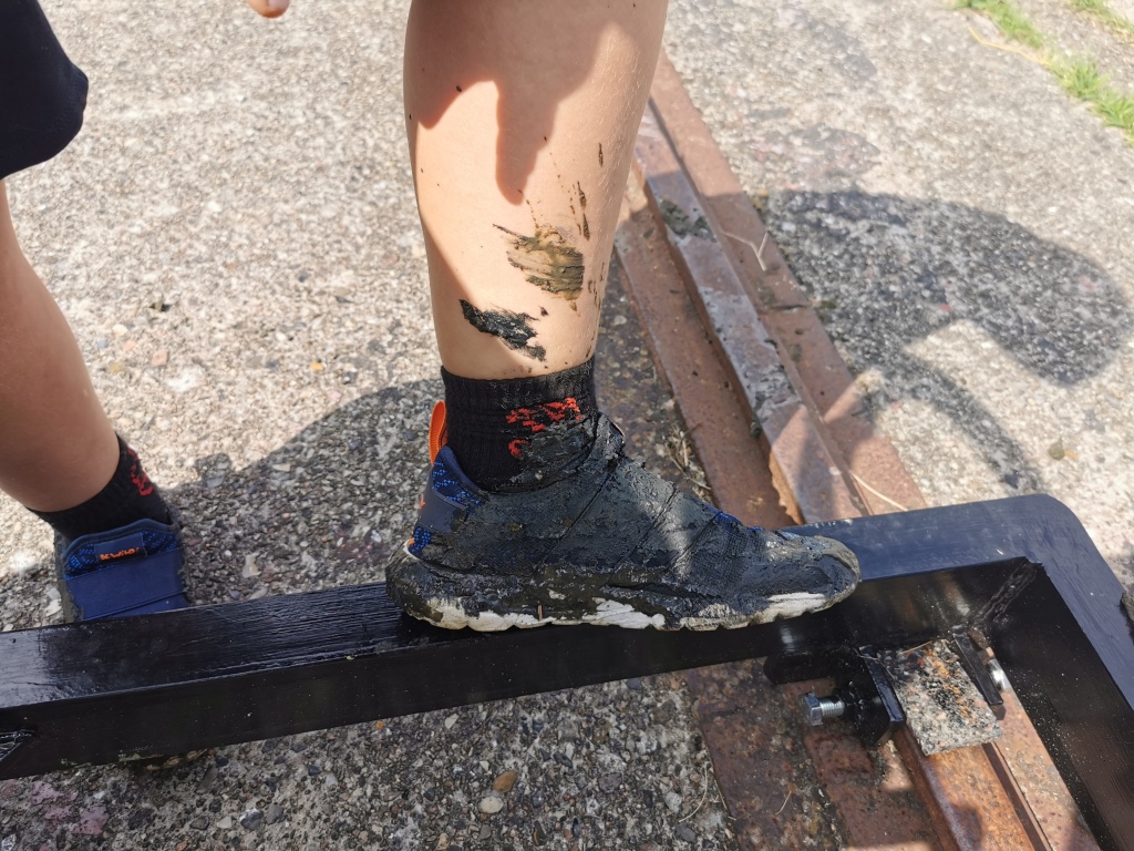 Wir spazieren auf die andere Seite des Hafenbeckens, wo Nils wenigstens einmal das Meer anfassen möchte. Der Bereich um die Spillanlage bei den Schiffen erscheint geeignet. Aber auch nur auf den ersten Blick, denn das zurückebbende Wasser hat einen matschigen, aber vor allem rutschigen Boden hinterlassen. Nils schafft es als einziger fast bis an die Wasserlinie. Aber eben nur knapp. Dann rutscht er doch auf dem glitschigen Boden weg. Glück im Unglück landet er nicht vollends im Schlick, sondern kann sich mit einem gekonnten Seitenschritt retten. Allerdings büßt sein linker Turnschuh dabei eine herrlich blaue Farbe zu Gunsten eines eher lehmigen Matschbraungrau ein. So ein Mist. Das könnte der erste Einsatz für die Außendusche unseres Wohnwagens werden…