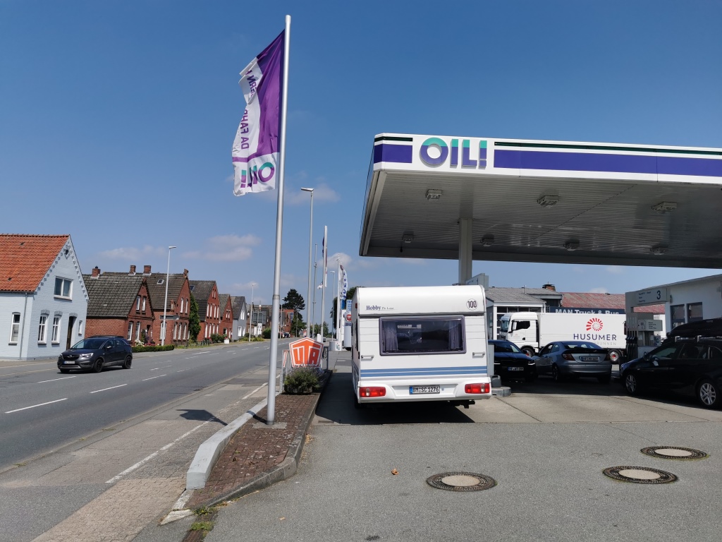 Wir verlassen Husum und halten wieder Kurs Nord. An der Ortsausfahrt entdecken wir noch eine Oil Tankstelle, die idealerweise auch auf der rechten Seite der Straße angesiedelt ist. Mit dem Wohnmobil habe ich früher schon ungern Tankstellen links angesteuert. Jetzt dem Gespann ist das fast schon elementar. Wenden ist wie gesagt immer schwierig!