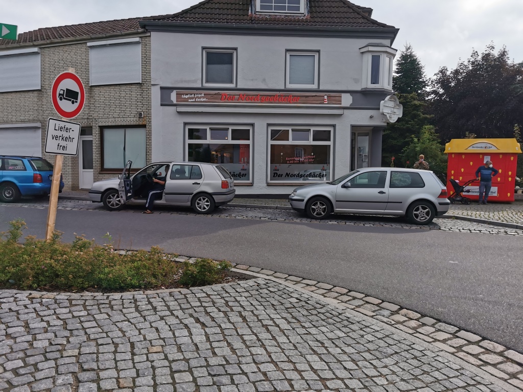Wir passieren Edeka und auch den Lidl, auf der Süderstraße geht es immer weiter bis zum Ortskern, wo auch der Nordseebäcker sein Geschäft hat. Bis kurz vor den Penny schaffen wir es, auf dem „Bürgermeister-Golz-Platz“ finden wir kurz darauf sogar ein ausreichend großes Areal, wo wir bequem nicht nur das Gespann abstellen, sondern sogar auch geradeaus rein und wieder heraus fahren können, ohne wenden zu müssen. Perfekt! Erste Feuertaufe bestanden. Mutig waren wir und es wurde belohnt. Wir stehen nur 200m vom Nordseebäcker entfernt.