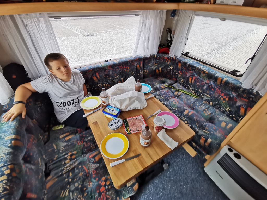 Zu Fuß geht es zur Filiale, wo sich coronabedingt eine kleine Schlange draußen vor dem Verkaufsraum gebildet hat. Wir stellen uns brav an, kaufen dann eine große Tüte mit Brötchen. Dazu einen großen Kaffee für Anja und drei Flaschen Kakao für die Jungs und mich. Hungrig geht es schnellen Schrittes zurück zum Wohnmobil, wo wir auf Bürgermeister Golz mit Kakao und Kaffee anstoßen und uns dann die leckeren Nordseebäcker- Brötchen schmecken lassen.