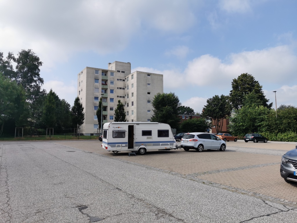 Gegen 11 Uhr erreichen wir Husum und jetzt wird es spannend! Anja hat sich Husum bei google Maps in der Satellitenansicht von oben angeschaut und einen Parkplatz ausgemacht, auf dem eindeutig nicht nur Wohnmobile, sondern auch Gespanne zu sehen sind! Zuerst dachten wir, es sei der offizielle Wohnmobilstellplatz von Husum am Hafen, aber dieser liegt dem Parkplatz am Porrenkoogsweg vorgelagert! Laut Bewertungen bei google ist die Einfahrt zwar etwas tricky und nachts ist das Parken für Camper verboten, aber dafür liegt der Parkplatz nah am Hafen und kostet nichts. Probieren wir es aus! Wie gesagt, Aufgabe dieser Reise ist eben auch, die Rundreisetauglichkeit von Auto und Wohnwagen gegenüber dem Wohnmobil zu beweisen! Auf einen Campingplatz am Stadtrand fahren, den Wohnwagen dort abzustellen und dann mit dem Auto allein in die Stadt zu fahren kann schließlich jeder. 😉